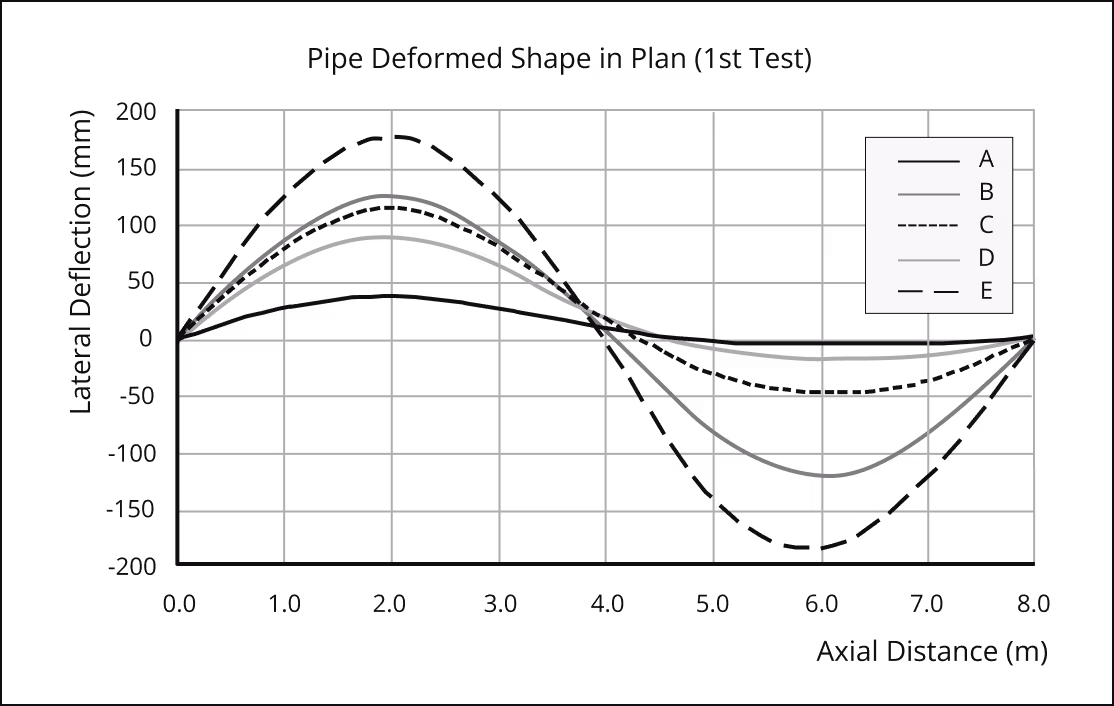 A series of global buckling tests were carried out to examine the system's ability to withstand significant axial compressive displacements while maintaining a hardening response that prevents strain concentration and wrinkle formation. The pipe and setup size were chosen to represent a comparable ratio of pipe axial stiffness to soil and Geobuffer resistance found in larger transmission lines.